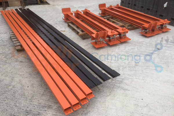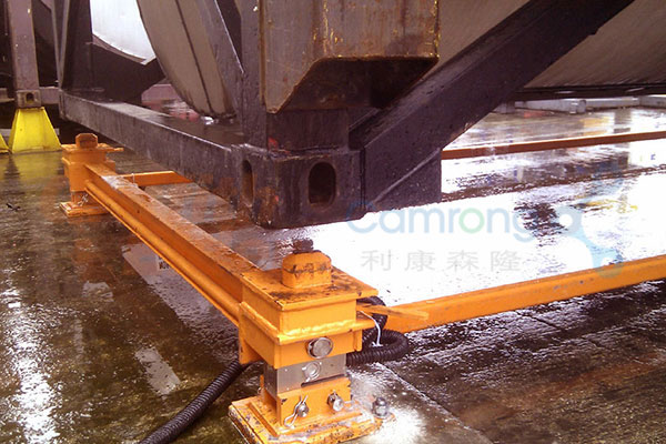 該平臺由兩個稱重梁構(gòu)成。每個稱重梁又由兩個12000千克載荷的稱重傳感器構(gòu)成,故整個系統(tǒng)可承載48000千克。在兩個稱重梁之間有兩個定位管,以確保兩稱重梁之間距離得當,且?guī)椭匚镎_的固定在稱重梁上。